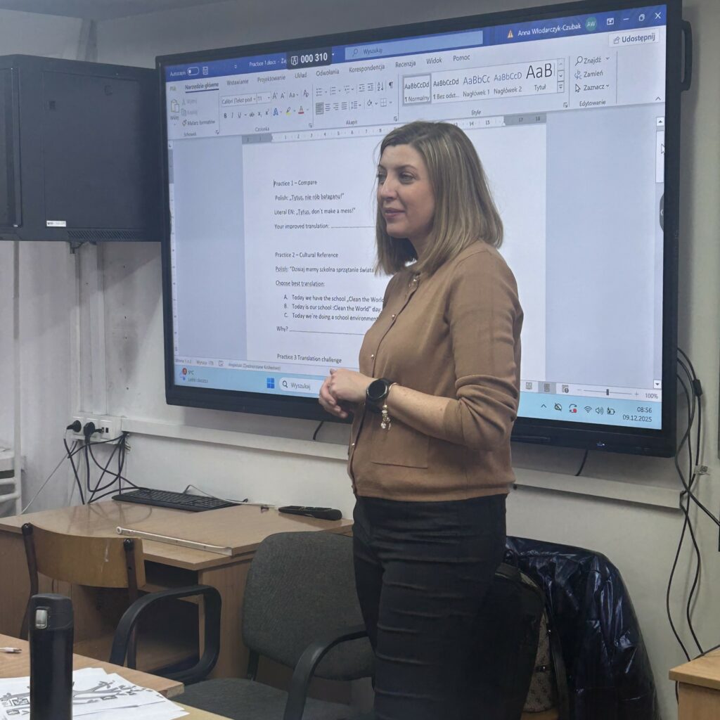 Zajęcia prowadziła mgr Anna Włodarczyk-Czubak w pracowni tłumaczeń pisemnych. Ponadto uczniowie mogli przekonać się na żywo, jak wygląda praca tłumacza ustnego, próbując swoich sił w kabinach tłumaczeniowych znajdujących się w pracowni tłumaczeń ustnych Katedry Neofilologii Wydziału Filologiczno-Pedagogicznego, dzięki uprzejmości dr Iwony Zamkowskiej.